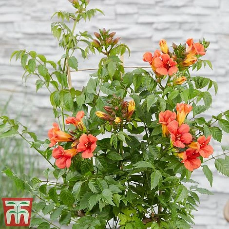 Forget the lanky Trumpet Vines of the past – these spectacular, deciduous climbers have been bred for a much shorter habit. Their compact, bushy growth makes them perfect for a sheltered sunny spot in the garden, or a conservatory indoors. Campsis are prized for their large, trumpet-shaped blooms and exotic colours, and these ones are particularly free-flowering so you can be sure of an impressive display. Height and spread: 1.5m (5′).