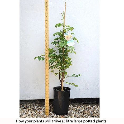 The Campsis series of the Trumpet Vine are compact and not as vigorous as other varieties. Campsis tagliabuana ‘Yellow Trumpet’ has showy rich golden-yellow trumpet-shaped flowers, lasting well into autumn. This hardy, deciduous shrub provides a backdrop of mid-green tooth-shaped leaves, which makes this an ideal choice for training up a small trellis or garden wall. Height & Spread: 1.5m (5′).