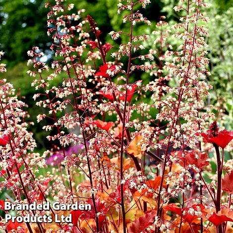 Forming a neat mound of ruffled leaves in striking and unusual shades of bronze, peach and pink, enhanced by bright pink undersides, Heuchera ‘Marmalade’ will brighten up any dull spot. This versatile and weather-resistant heuchera is a great choice for a shady corner but also tolerates full sun, putting on a showy display all year round with its stunning evergreen foliage. Slender sprays of small white flowers appear in late spring or early summer. Perfect for borders, containers or edging paths and beds. Height: 25cm (10in). Spread: 45cm (18in).