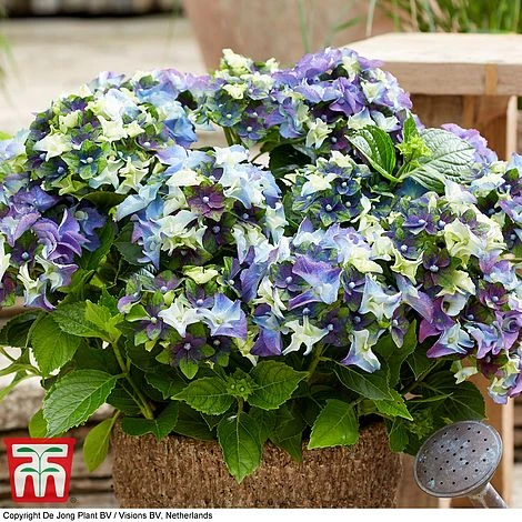 A new and exciting variety of Hydrangea macrophylla from the innovative Royalty Collection. The mophead blooms are made up of clusters of multi-tonal flowers to create a breath-taking kaleidoscope effect. Each individual flower blends from mauve-blue to creamy-white and apple-green, so that no two are ever the same.