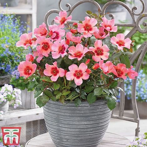 - Rose ‘Eye of the Tiger’ – Semi double, apricot yellow blooms are splashed with red at their centre for an attractive summer display. For the perfect mini climber, train the compact stems up short supports. Height and spread: 90cm (36″).