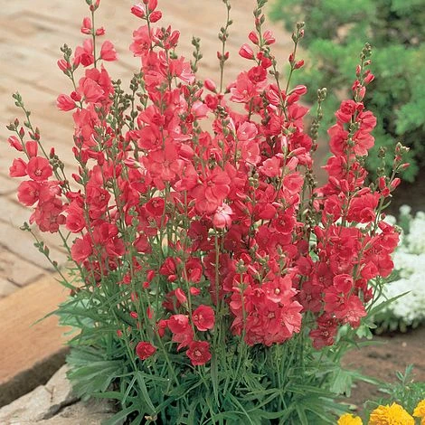 Upright flower spikes carrying rose-pink and white blooms make a colourful display in midsummer. Sidalcea hybrida ‘Party Girl’ is a showy variety of this classic cottage garden perennial, forming neat, clumps of rounded foliage. Prairie Mallows are superb for filling gaps in borders and make pleasing cut flowers for summer bouquets. Height: 90cm (36″). Spread: 45cm (18″).