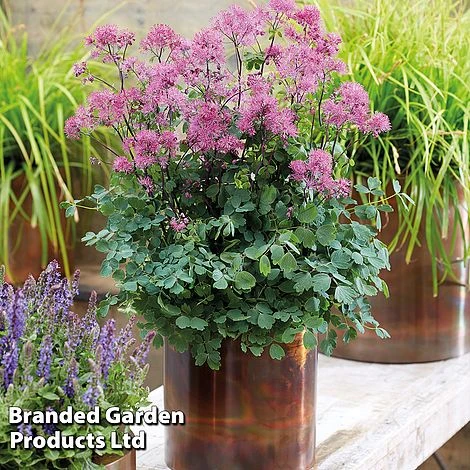 Thalictrum aquilegifolium is a delicate-looking, airy plant which boasts both beautiful foliage and unusual fluffy flowers. The bluish-green, divided foliage is held in elegant tiers, resembling a Maidenhair fern. In June and July, slender, upright stems burst into dainty, cloud-like puffs of pinkish-mauve flowers. Perfect for a shady border in reliably moist soil. Height: 1m (40”). Spread: 45cm (18”).