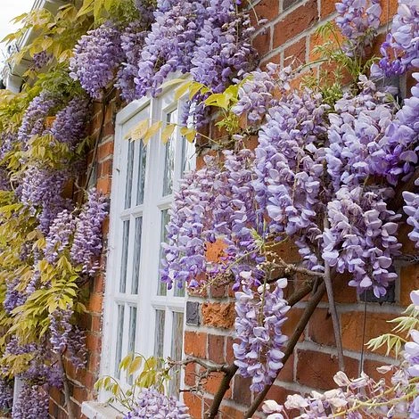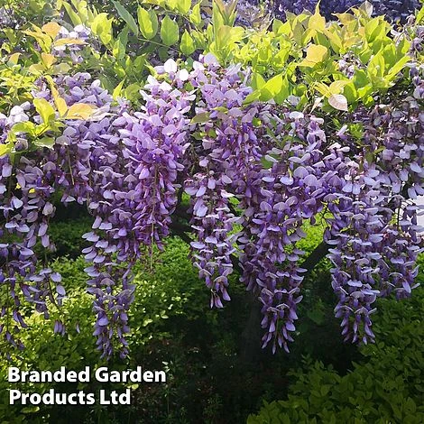 Heavenly scented lilac-blue pendants create a breathtaking sight as they arrive in abundance each May attracting bees and pollinators to your garden. Train this wonderful climber onto walls, trellises and fences for exceptionally beautiful displays every year. The hardy shrub reaches a staggering 9m high and 5m across creating a wall of colour throughout May and June. Height: 9m (28′). Spread: 5m (16′).